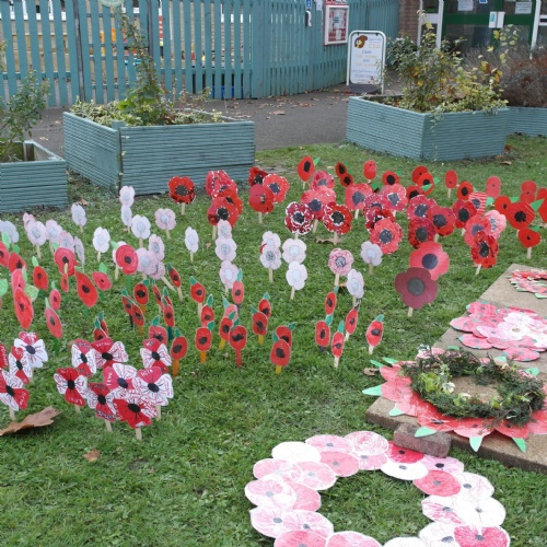 As part of our acts of remembrance we have again created our Garden of Remembrance at the front of the school. The children and school staff wanted to again make sure that we paid our respects to remember the fallen and serving members of the armed forces of past and present conflicts.