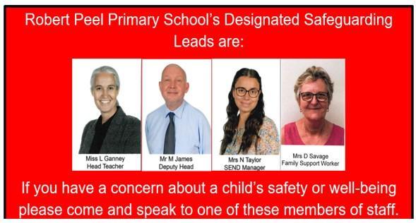 At Robert Peel Primary School, the health, safety and well-being of every child are our top priority. We expect all staff, governors, and volunteers to share this commitment to safeguarding our children. We listen to our children and take seriously what they tell us. Our aim is that children will enjoy their time as pupils in this school.